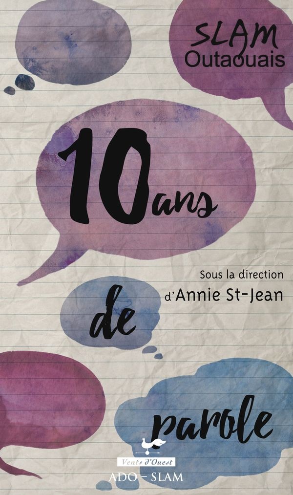 Le recueil 10 ans de parole, dirigé par Annie St-Jean, souligne les dix ans d’existence de SlamOutaouais, et permet de faire découvrir les textes dans toute leur variété des slameurs d’hier et d’aujourd’hui, adultes et adolescents, autrices et auteurs professionnels et de la relève.